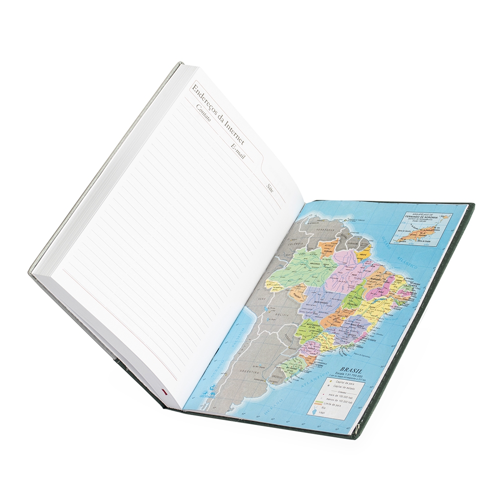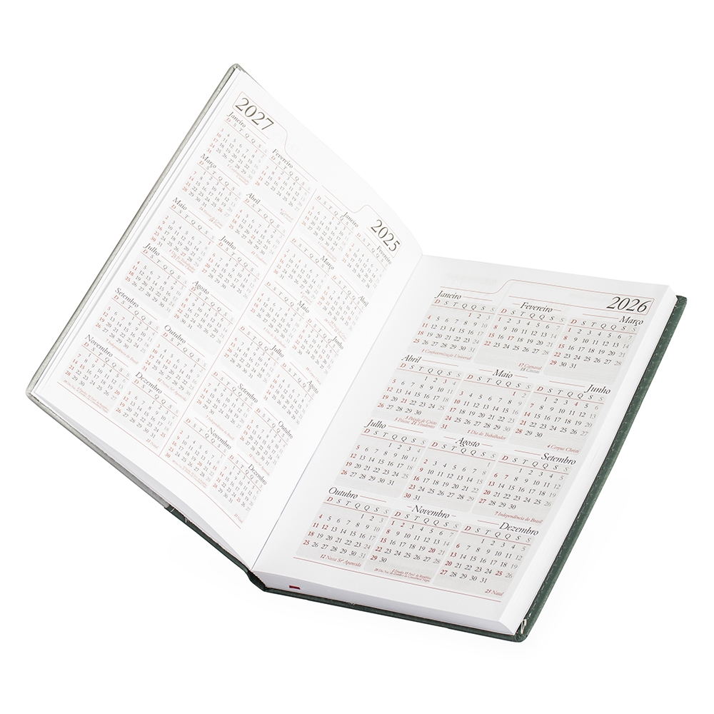 Agenda diária 2026 de couro sintético. Contém fita de cetim marca página, dados pessoais, calendário de 2024 à 2026, mapa do Brasil, mapa-múndi, índice telefônico e planejamento. Altura : 20 cm Largura : 14,7 cm Espessura : 2 cm