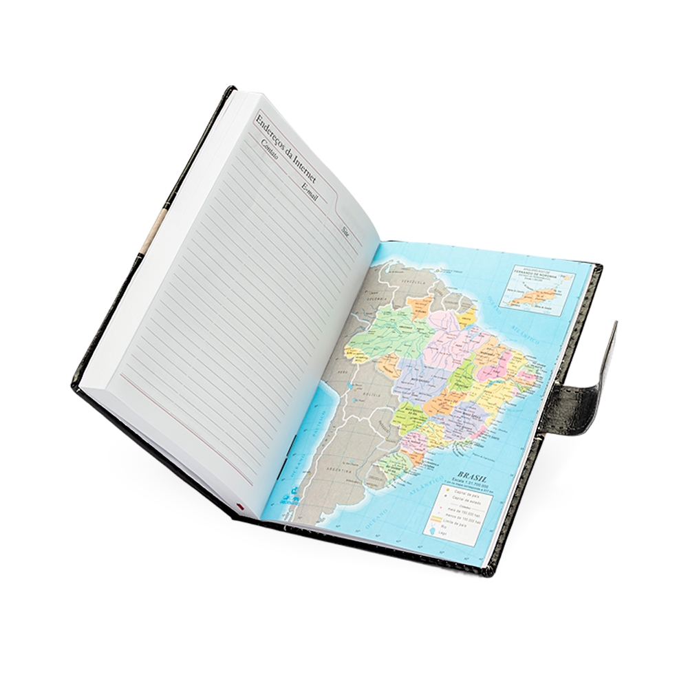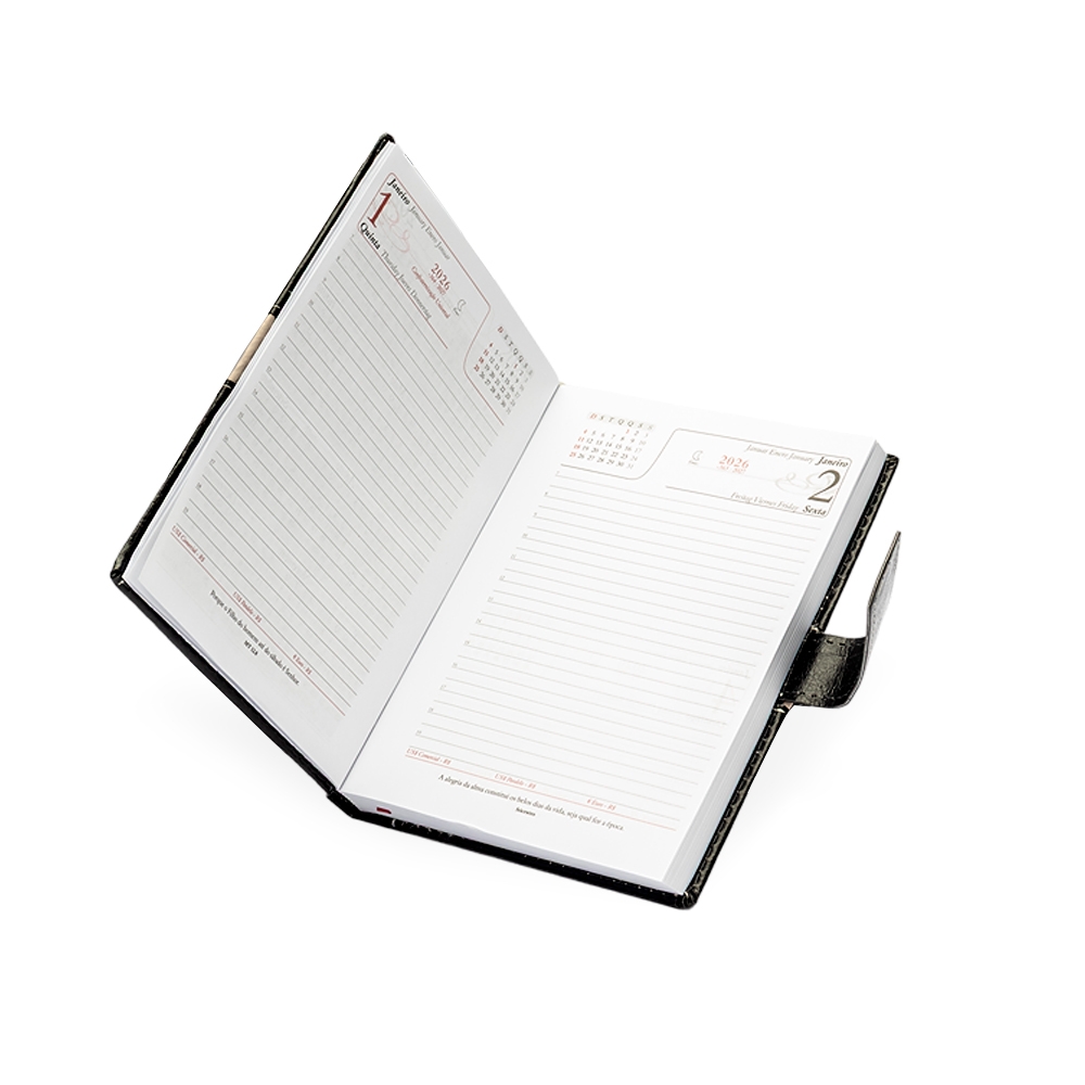 Agenda diária 2026 com capa em couro sintético, marca-páginas em fita de cetim e fecho com suporte para caneta. Contém páginas dedicadas para dados pessoais, calendários de 2025 a 2027, lista de contatos, planejamento e mapas. Altura : 20 cm Largura : 14,5 cm Espessura : 2 cm