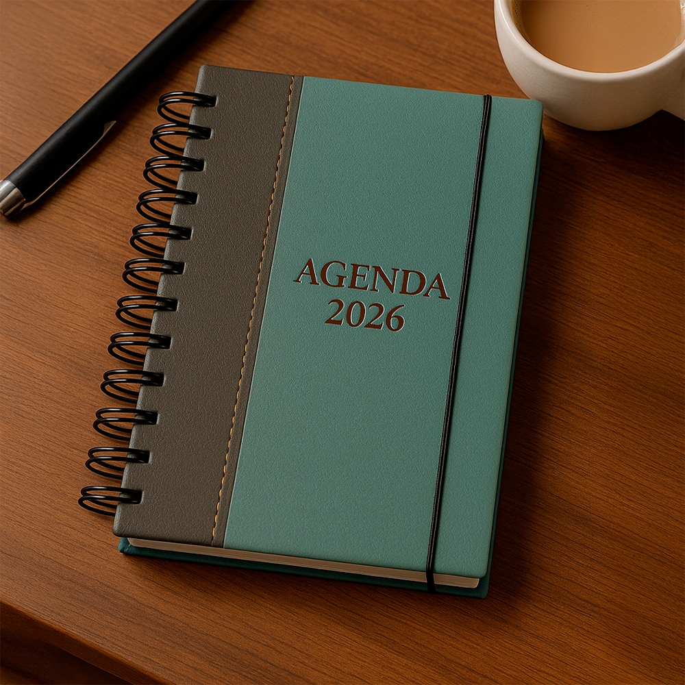 Agenda diária com capa dura, encadernação Wire-O, marca-páginas cetim e elástico fechamento. Contém páginas dedicadas a dados pessoais, calendários de 2026 a 2028, planejamento mensal e lista de contatos. Altura : 18,9 cm Largura : 15 cm Espessura : 2,5 cm