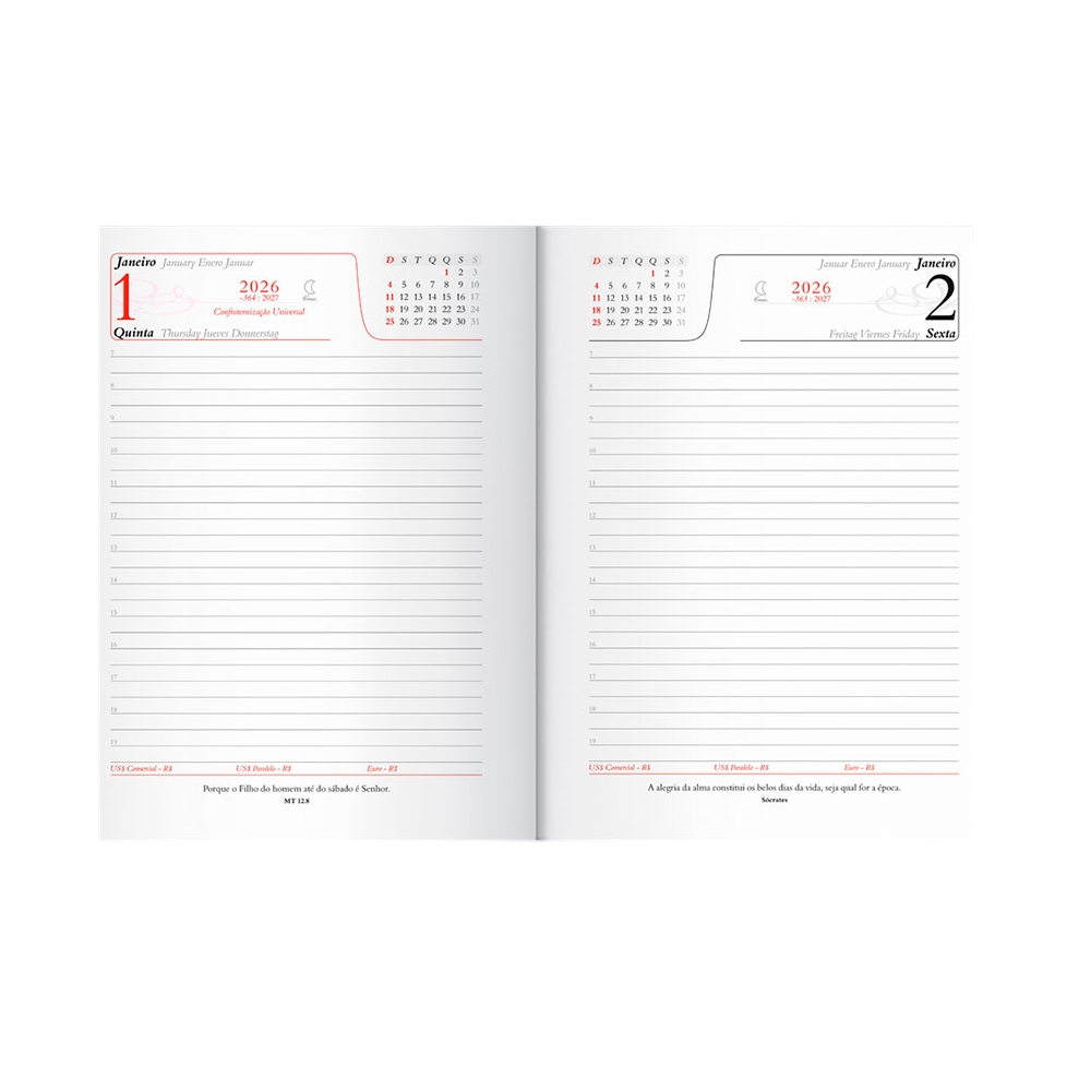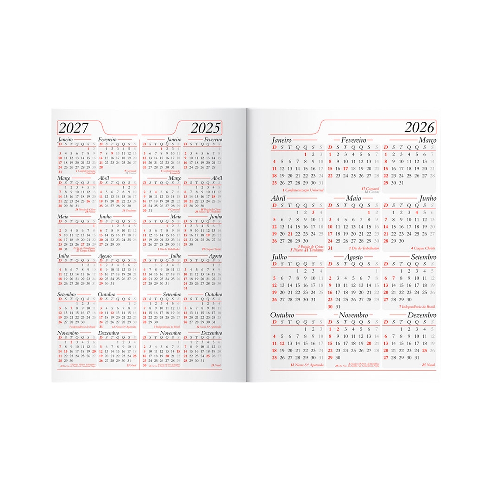 Agenda diária 2026 com capa em couro sintético e marca-páginas em fita de cetim. Contém páginas dedicadas para dados pessoais, calendários de 2025 a 2027, lista de contatos, planejamento e mapas. Largura : 14,5 cm Espessura : 1,8 cm Comprimento : 20 cm