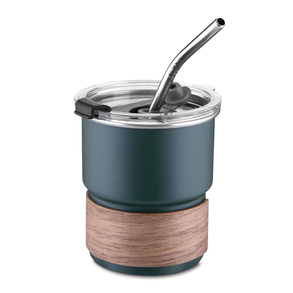 Copo em inox 304 de parede simples e capacidade máxima de 250ml. Possui tampa rosqueável em plástico com protetor para o bocal e acesso para canudo. Dispõe ainda de luva em fibra de noz e acompanha canudo curvado em inox. Altura : 9,4 cm Largura : 8,8 cm Circunferência : 22,9 cm