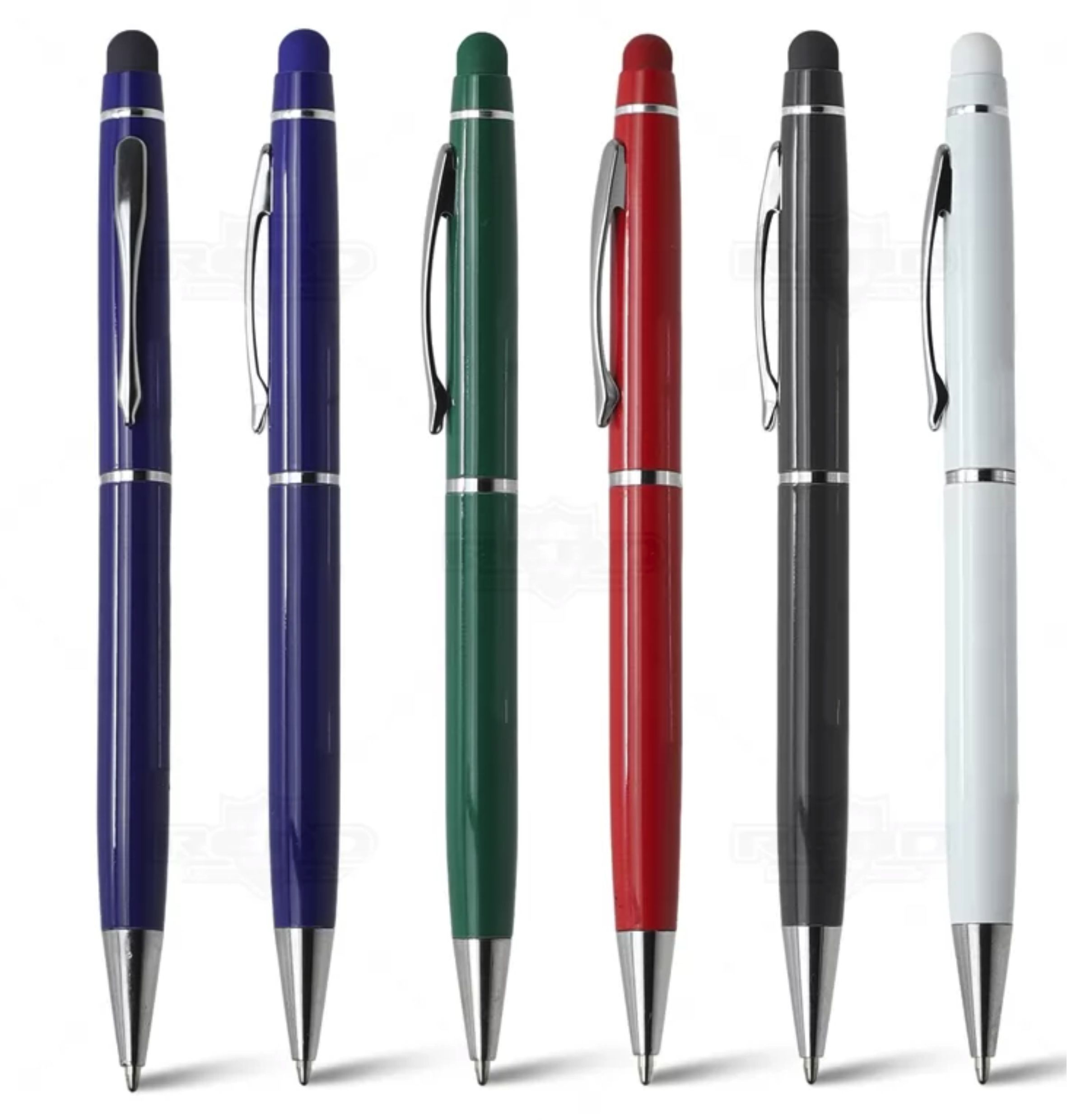 Caneta metal com touch screen, carga esferográfica azul 1.0 mm e acionamento por rotação. Largura : 1,3 cm Comprimento : 14,1 cm