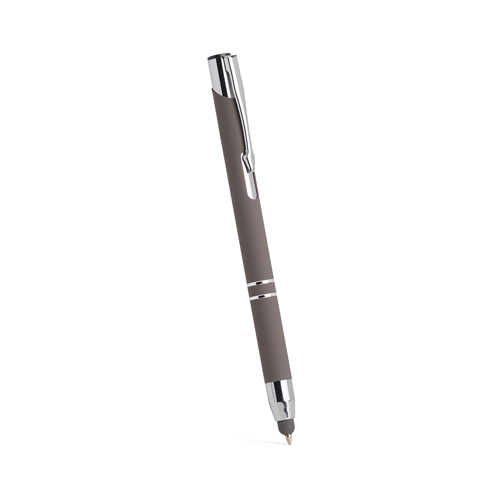 Caneta esferográfica com carga azul de 1.0mm e acionamento por clique. De construção metálica, também possui ponteira emborrachada que permite seu uso como uma caneta touch para interação com dispositivos de tela sensível ao toque. Largura : 1,2 cm Comprimento : 13,5 cm