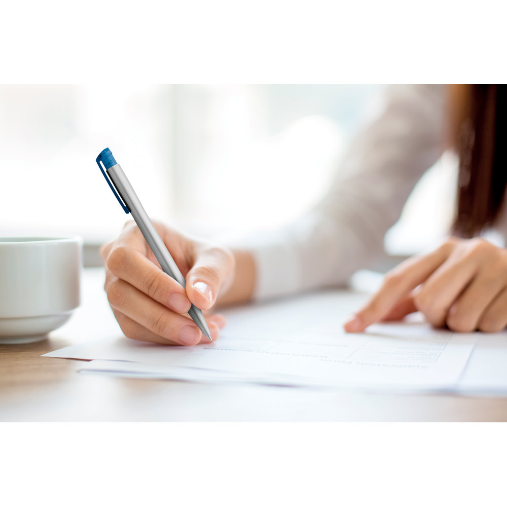 Esferográfica em ABS com acabamento metalizado e clipe translúcido colorido. Até 1,5 km de escrita. ø11 x 136 mm