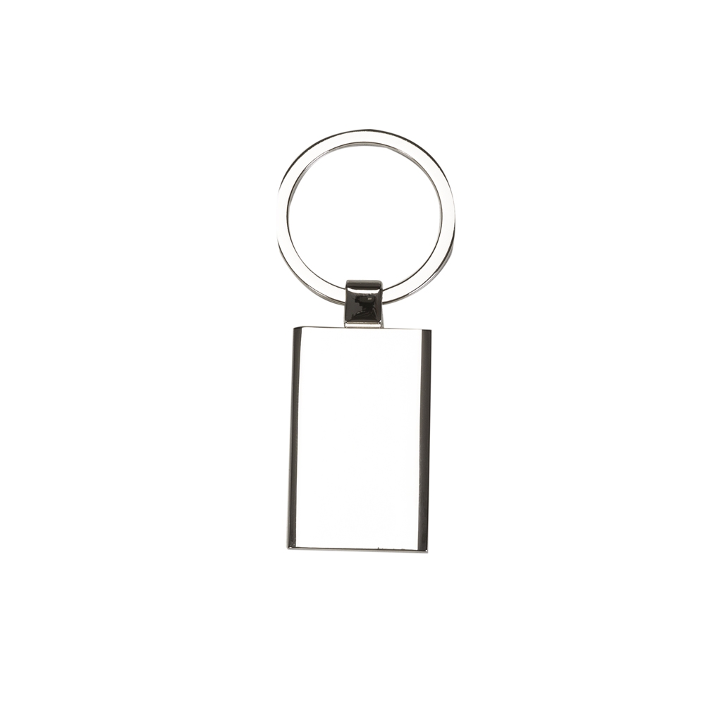 Chaveiro de metal retangular com chapa central, verso liso. Tamanho total aproximado (CxL): 8 cm x 3,4 cm