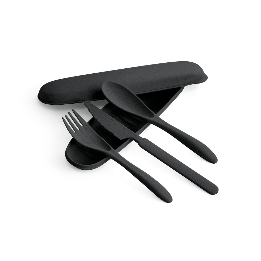 Conjunto de 3 talheres em fibra de bambu (60%) e PP (40%) com garfo, faca e colher. Incluso estojo. Certificação EU Food Grade. 205 x 65 x 25 mm