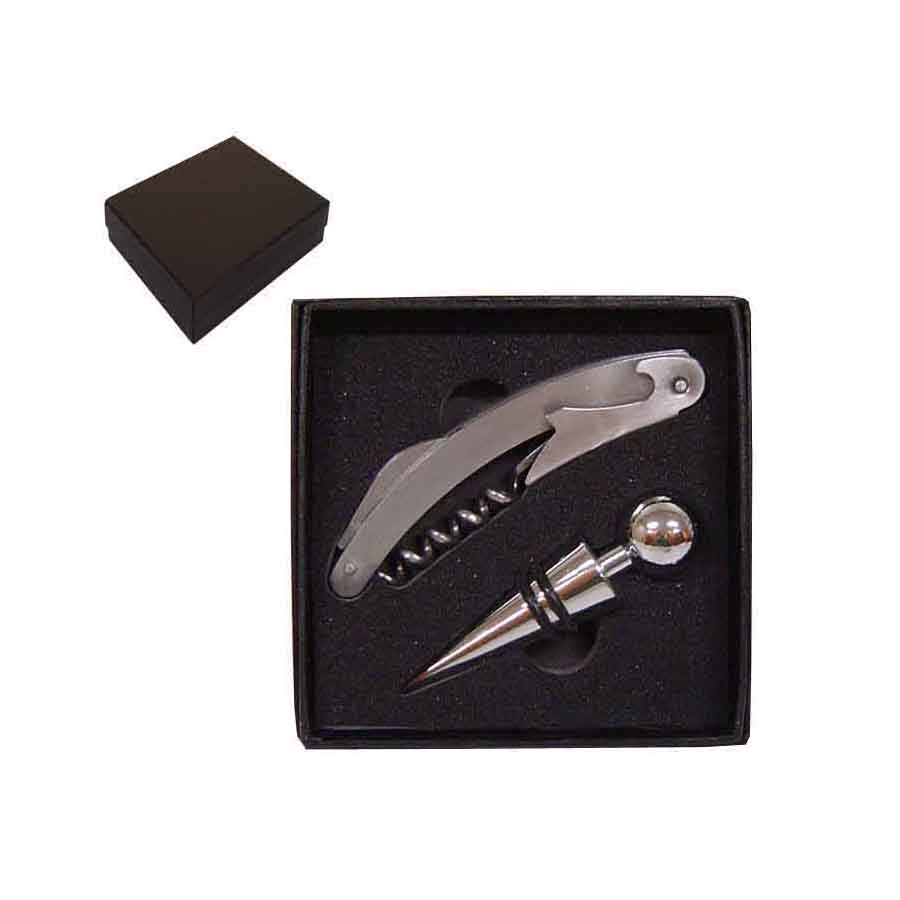 Kit vinho 2 peças em estojo com tampa, contém saca-rolhas metálico com lâmina de corte e abridor de garrafa e tampa de bico. Área interna do estojo com berço de espuma. Acompanha plaquinha metálica para personalização.
