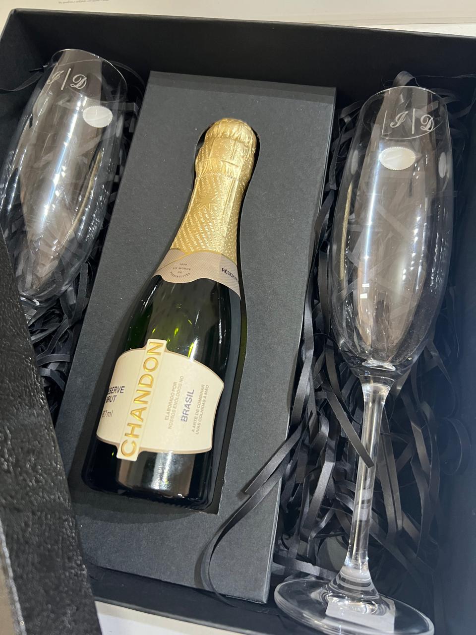 Kit Executivo de Vinho Mini Chandon e 2 Taças de Cristal Gravadas a Laser em Caixa Cartonada Personalizada para Presente. Um Brinde sofisticado para celebrar os bons momentos de clientes, parceiros de negócios e colaboradores Skitvinho