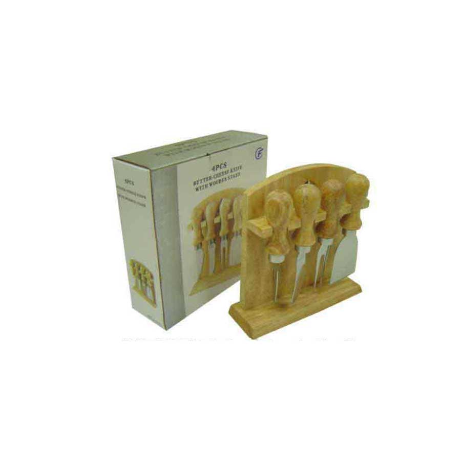 Kit queijo com 5 peças em madeira. Contém faca reta, faca com ponta, garfo, espátula e suporte de encaixe com borrachas antideslizantes na parte inferior.