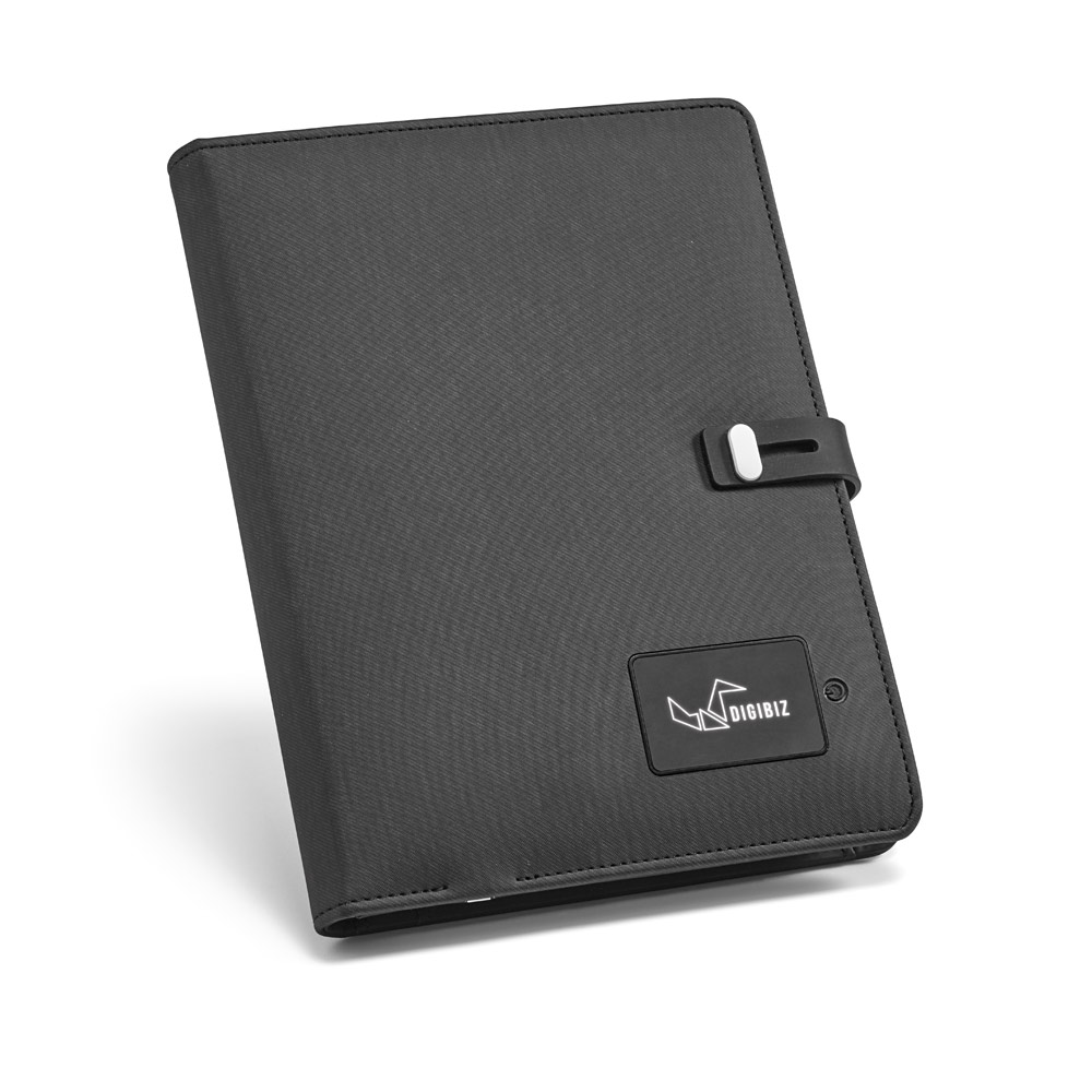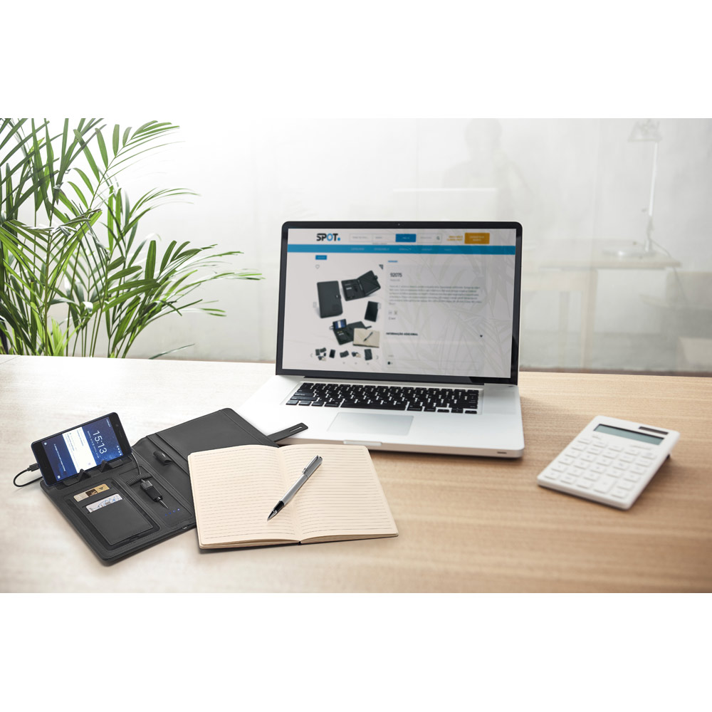 Pasta A5 em c. sintético com bateria portátil embutida (lítio). A bateria tem capacidade para 4.000 mAh, tempo de vida ≥ 500 ciclos com entrada/saída 5V/1A e cabo USB-C para carregar a bateria. No interior, contém um caderno removível com 128 páginas pautadas de cor marfim, um suporte para esferográfica (não inclusa), elásticos para organização e suporte para smartphone. No exterior, uma placa com acabamento emborrachado, LED interior e botão on/off. Fornecida em caixa presente. 165 x 225 x 25 mm | Placa: 55 x 35 mm | Caixa: 180 x 240 x 35 mm