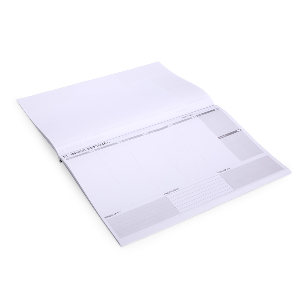 Planner semanal com cerca de 55 folhas destacáveis para anotações e organização ao longo da semana. Largura : 30,5 cm Espessura : 0,6 cm Comprimento : 21 cm Medidas aproximadas para gravação (CxL): 17 cm x 28 cm Peso aproximado (g): 303