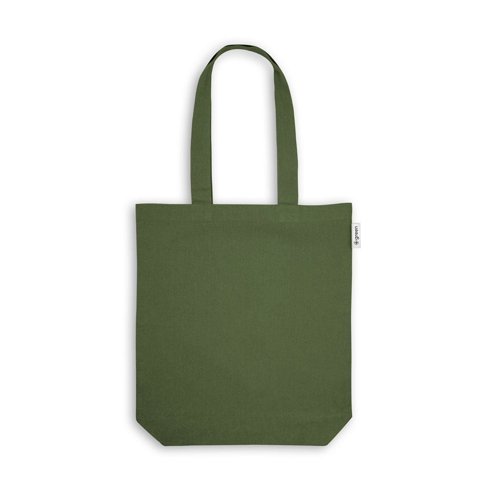 Sacola em 50% algodão, 30% algodão reciclado e 20% poliéster reciclado (220 g/m²), com alças de 62 cm. 380 x 400 x 100 mm